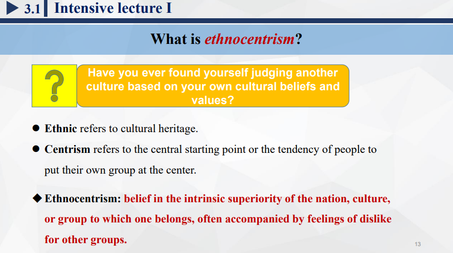 2. 概念探究:结合引入话题,通过教师讲授、小组讨论、快问快答等方式探究并同时巩固ethnocentrism、stereotype、prejudice、discrimination等概念的主要教学内容。