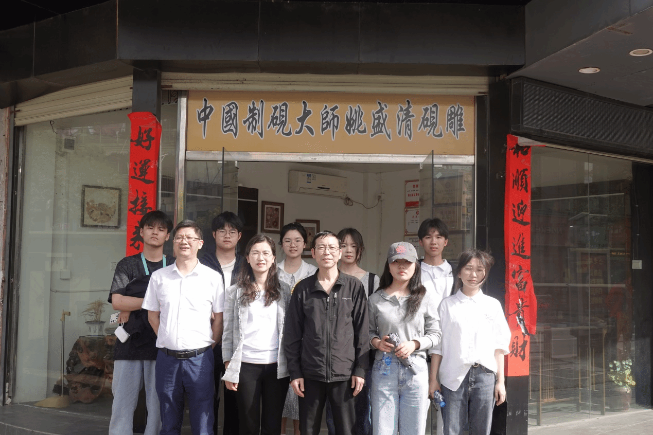 首先,师生团队前往庐山金星砚博物馆调研。为了给同学上好这堂实践教学课,博物馆馆长李平寒凭借30多年的非遗传承经历和丰富的专业知识,以饱满的热情生动地讲解了金星砚的石品、石质、历史、制作流程和技法等,带领着同学们深度探索国家非遗。在李馆长的带领下,师生们看到博物馆里的每一件展品都“活”了起来,了解到每件展品背后的历史故事及文化内涵。