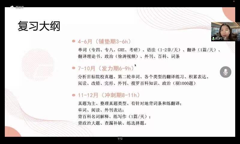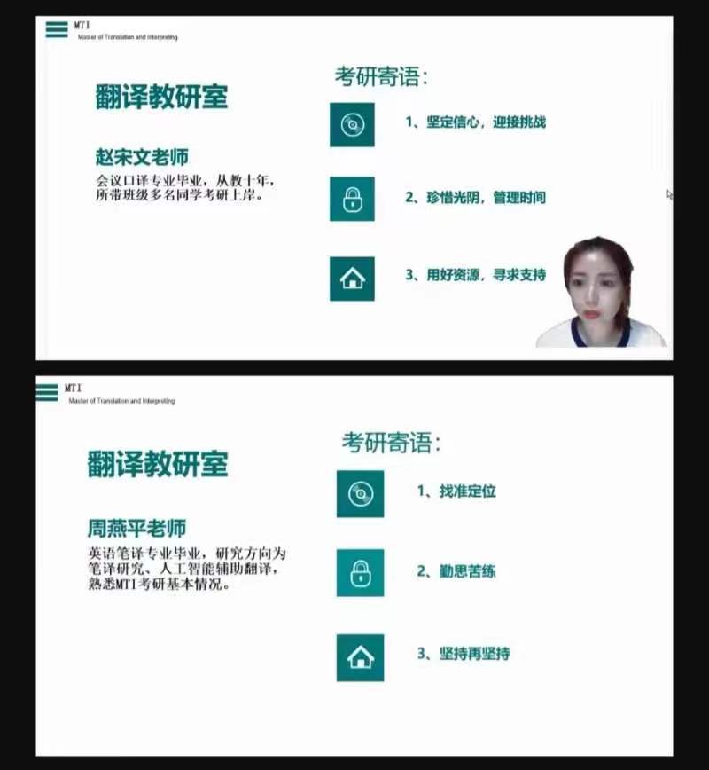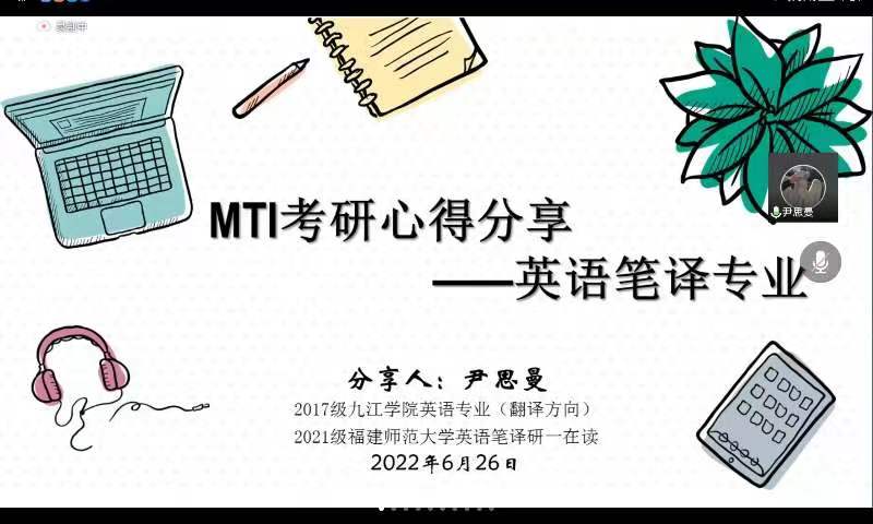 暑期将至,考研备考正当时。德赢ac米兰官方合作一直高度重视考研工作,通过多种举措鼓励广大学生积极参加考研。在学院领导的支持和关心下,近年来学院考研率节节攀升,屡创佳绩。为进一步帮助学生明确考研目标,掌握考研技巧,解答相关考研困惑,德赢ac米兰官方合作翻译教研室于6月26日线上举办翻译专业MTI考研经验交流会。本次会议由翻译教研室主任赵宋文主持,翻译教研室教师周燕平发言,7位成功考取翻译硕士MTI的同学主讲。学院各级各专业近百名学生参会。