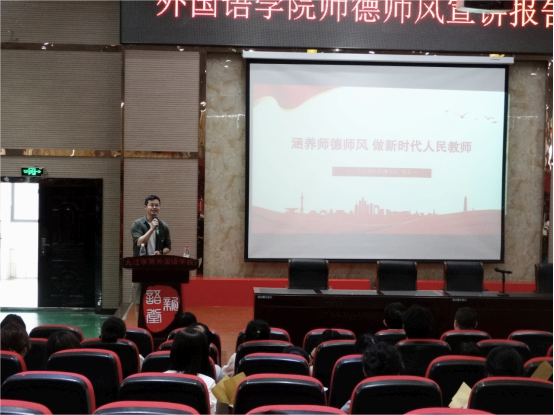 宣讲会上,倪竞博士做了题为“涵养师德师风 做新时代人民教师”的辅导报告,他围绕“教书为基,育人为本”“专注科研,勇于探索”“立足校园,服务社会”三方面与大家分享自己为师从教、心理育人的心路历程。他表示,为师者要不断在专业领域内深耕细作、敢为人先、潜心科研,不断探索新的教学模式,激发和培养学生的学习兴趣和专业情感。同时要走出课堂、走进学生生活,创新教育方式,积极投身到育人工作中,以平等平和的态度对待学生、关爱学生,帮助同学们突破学习瓶颈、收获全面成长、体会人生价值、找到学习成就感。倪竞博士的报告语言朴素,感情真挚,博得在场教职工的强烈共鸣。