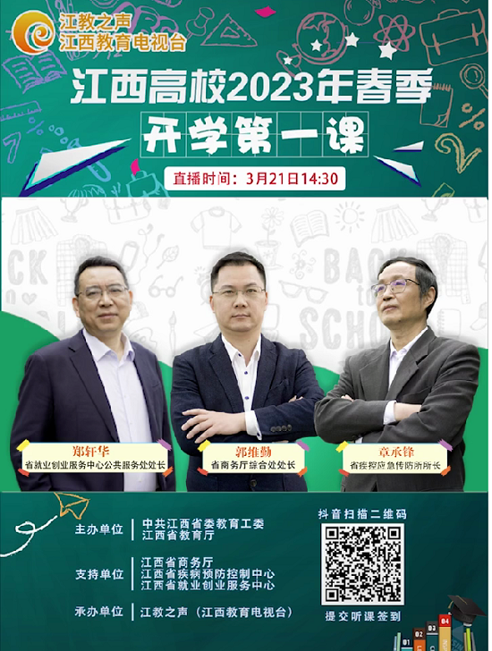 “开学第一课”由中共江西省委教育工委和省教育厅主办,邀请了省疾控应急传防所所长章承锋、省商务厅综合处处长郭维勤、省就业创业服务中心公共服务处处长郑轩华为主讲嘉宾。三位主讲嘉宾为同学们详细讲解了新冠疫情防控策略及个人防控指南、最新经济运行形势分析、后疫情时代大学生就业形势与促进就业采取的激励措施。