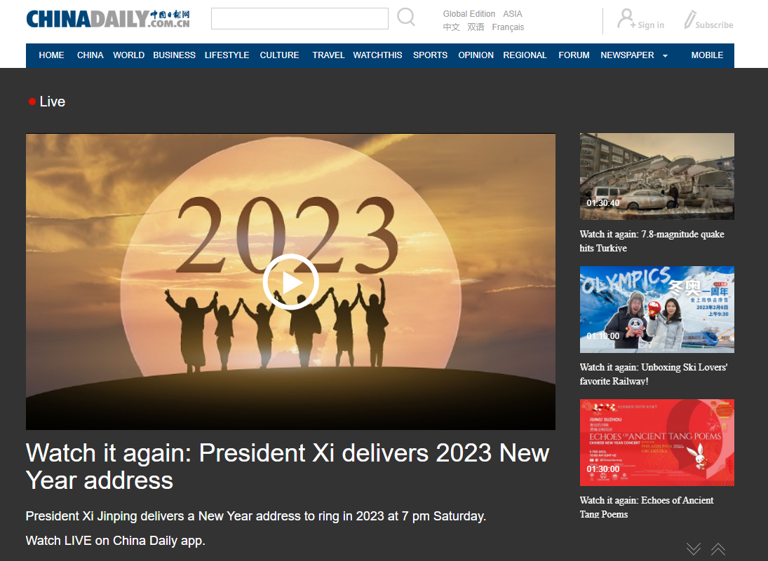 2023年新年前夕,习近平主席发表二〇二三年新年贺词,总结今天的中国,展望明天的中国。豪情满怀的宣示、语重心长的嘱托、殷切深情的祝福,给人以深刻的启示、奋进的力量,激励亿万人民踔厉奋发、勇毅前行,锚定奋斗目标,创造新的伟业。
