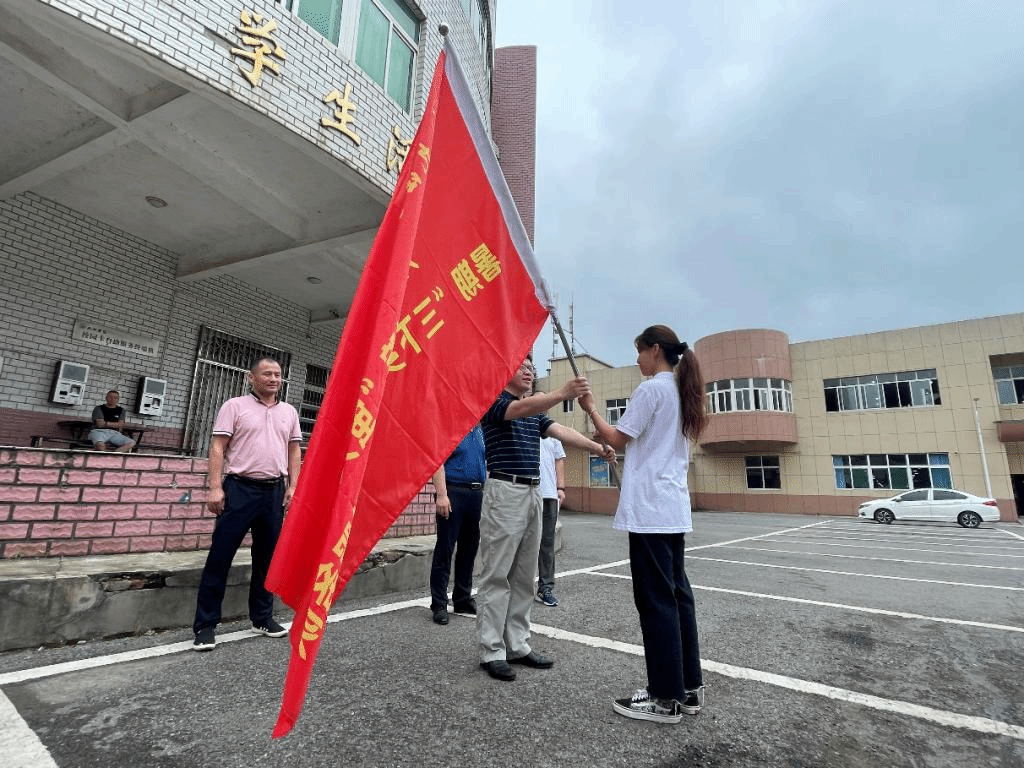 旗帜在手,责任在肩。周志高为“萤火虫”社会实践服务队授旗,宣布2022年大学生暑期“三下乡”社会实践调研活动正式启动。