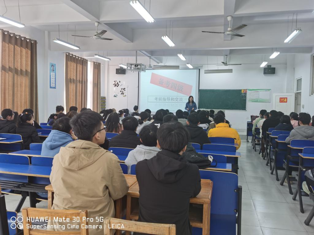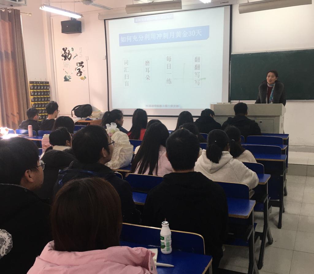 下午1点30分,315教室已入座了120余名学生,这些来自不同学院的学生即将参加12月份四级考试,同学们认真聆听了程维娟老师的讲授内容。 程老师结合PPT展示,首先介绍了考试流程和注意事项。接着针对不同的题型、分值和答题时长,程老师举例详解了多样的答题技巧。最后,程老师强调了考前复习的重要性,从词汇扫盲、磨耳朵、每日一练和翻翻写写给予指导,建议同学们考前黄金30天要在心理上解压、在行动上不降压,做好最后的冲刺。