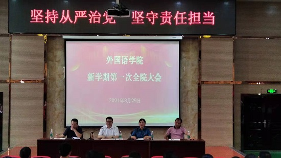 会上,院长周志高传达了新学期学校领导干部会议精神,并对德赢官网暑期工作进行了总结。周志高指出,今年是“十四五”规划开局之年,在学校党委和行政的正确指导下,德赢官网各项工作运行良好,顺利完成了第二轮岗位竞聘工作,“双提高”大讨论、专业综合评价稳步推进,疫情防控、毕业生就业择业扎实有效。周志高对新学期工作进行了全面部署,希望全体教职工围绕学院中心工作,全力以赴推进专业综合评价,加强省级、国家级一流专业建设。他强调,外语作为一门学科,肩负着文化文明的传承,我们要发挥学院、学科优势,寻求服务地方高质量发展的契合点,着力于提高德赢官网教育教学水平和人才培养质量。