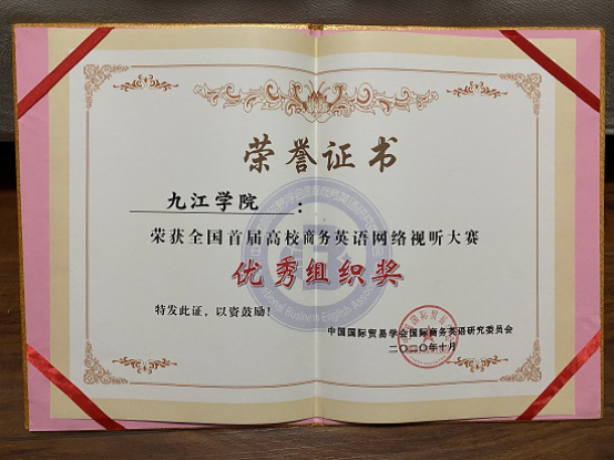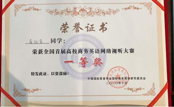 2020年10月31日,全国首届高校商务英语网络视听大赛暨商务英语教学研讨会在浙江越秀德赢ac米兰官方合作举行。经过层层角逐,我校德赢ac米兰官方合作A1742班学生詹伦莹摘得一等奖,A1741班的兰琪荣获二等奖,德赢ac米兰官方合作获优秀组织奖。