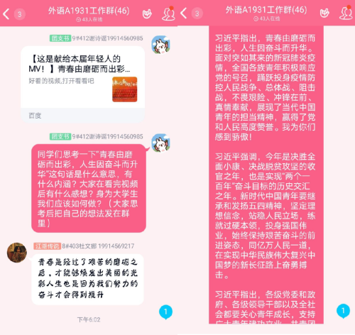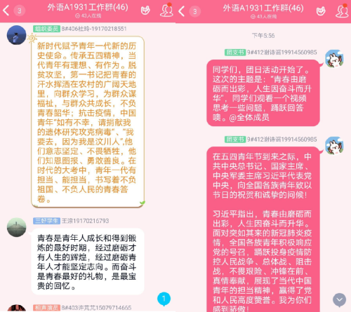 吾辈中国,青年奋起。为纪念“五四运动”101周年,贯彻落实习近平总书记寄语新时代青年的讲话精神,让广大团员切身认识到五四精神的重要性,让中国精神焕发光彩、薪火相传,5月7日德赢ac米兰官方合作大一年级各班运用微信、腾讯QQ等平台,以在线共同观看视频、讨论相关图片等形式开展了以“青春由磨砺而出彩,人生因奋斗而升华”为主题的线上团日活动。