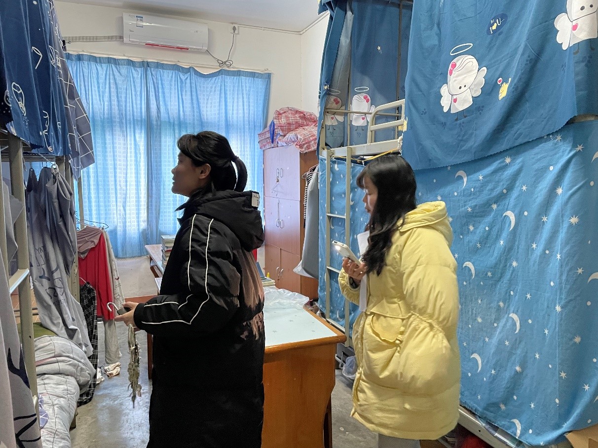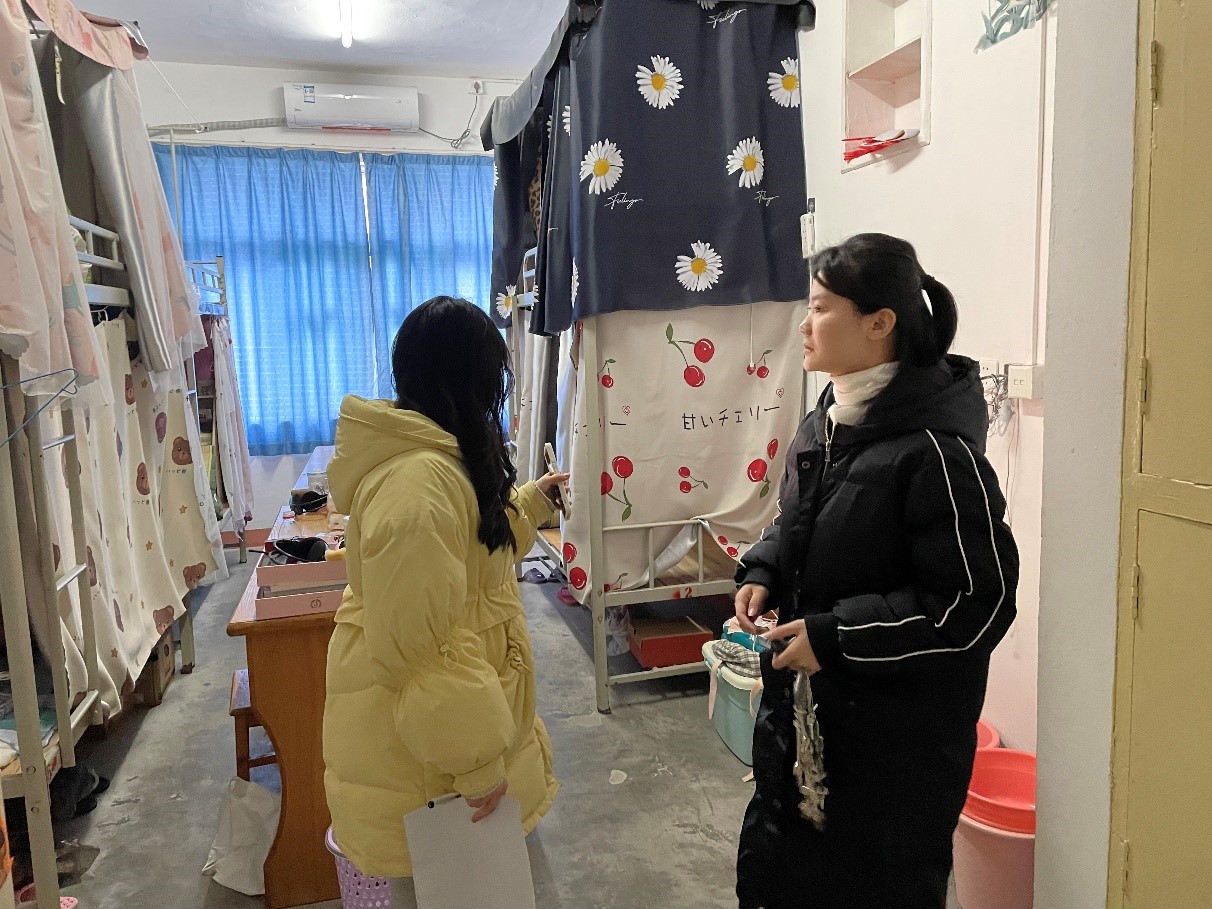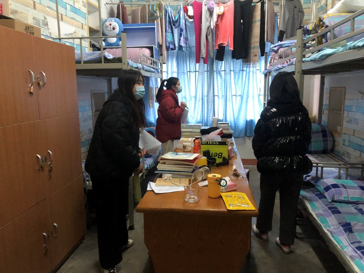 本次检查的重点是学生寝室的卫生状况及大功率电器的使用情况。各位老师与学生干部逐一排查每间寝室,老师们关切的询问同学们返校是否适应,最近天气寒冷,叮嘱一定要注意保暖,辅导员们特别关注省外返校同学情况。在检查过程中,督促每位同学在日常生活中务必注意用电安全和寝室消防安全,同时叮嘱他们在疫情防控期间做好个人防护。通过此次的寝室安全排查,加强了老师与同学们的沟通与交流,增进了老师与学生的了解,使师生关系更为融洽,更好地落实寝室安全工作。
