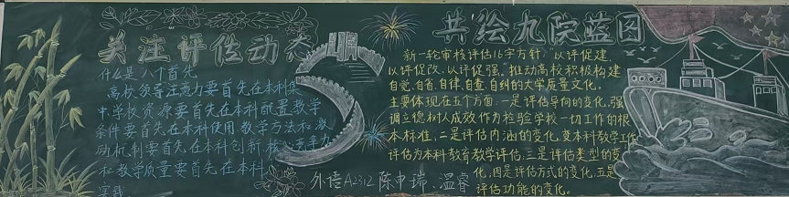 为进一步加强本科教育教学审核评估知识的学习宣传力度,营造学生积极参与审核评估活动的浓厚氛围,德赢ac米兰官方合作通过更新宣传栏、组织开展本科教育教学水平评估知识黑板报评比等方式,进一步强化学习宣传力度。各班级黑板报作品精彩纷呈,在色彩运用、文字内容、布局排版等方面突显了同学们对本科评估工作的深刻理解和创意表达。